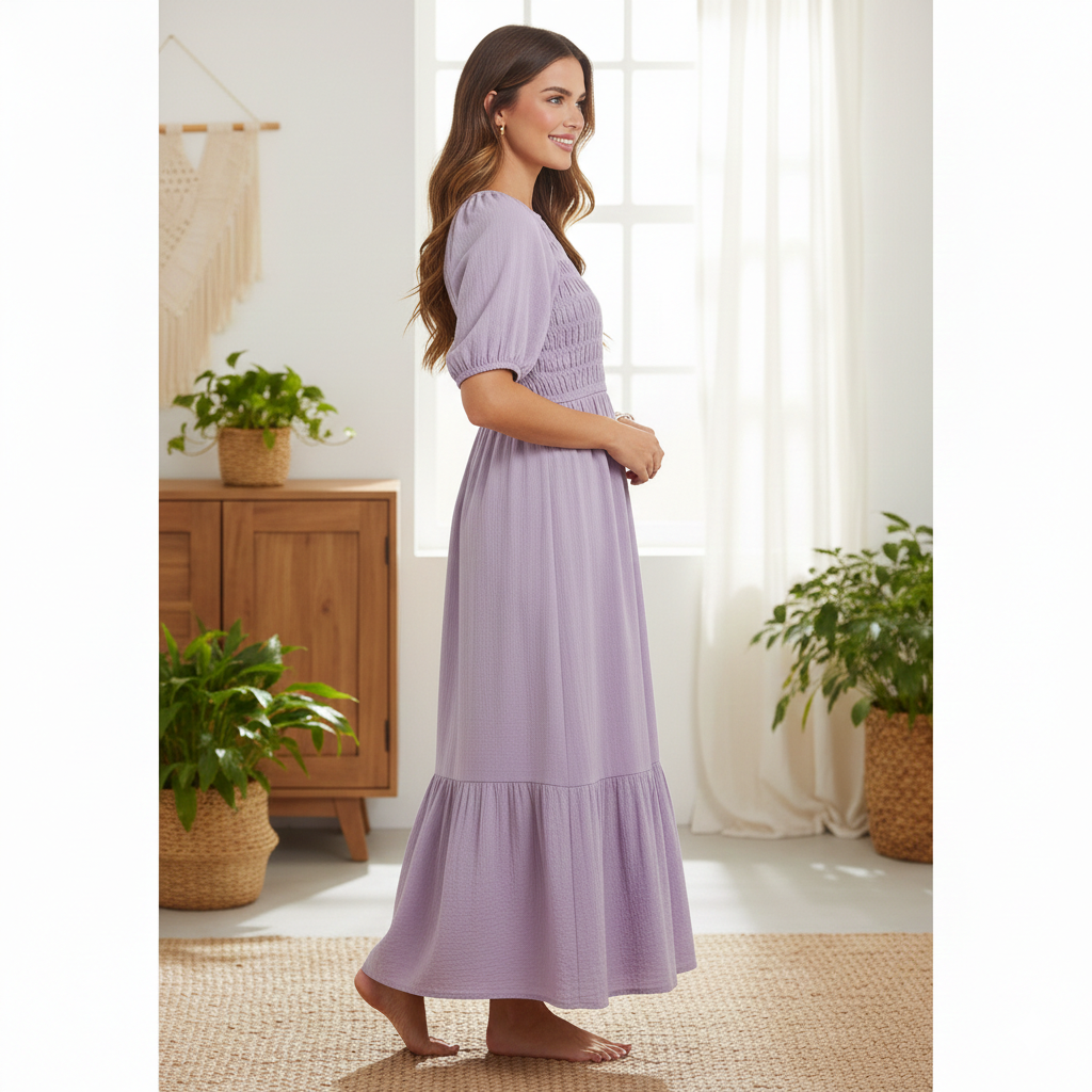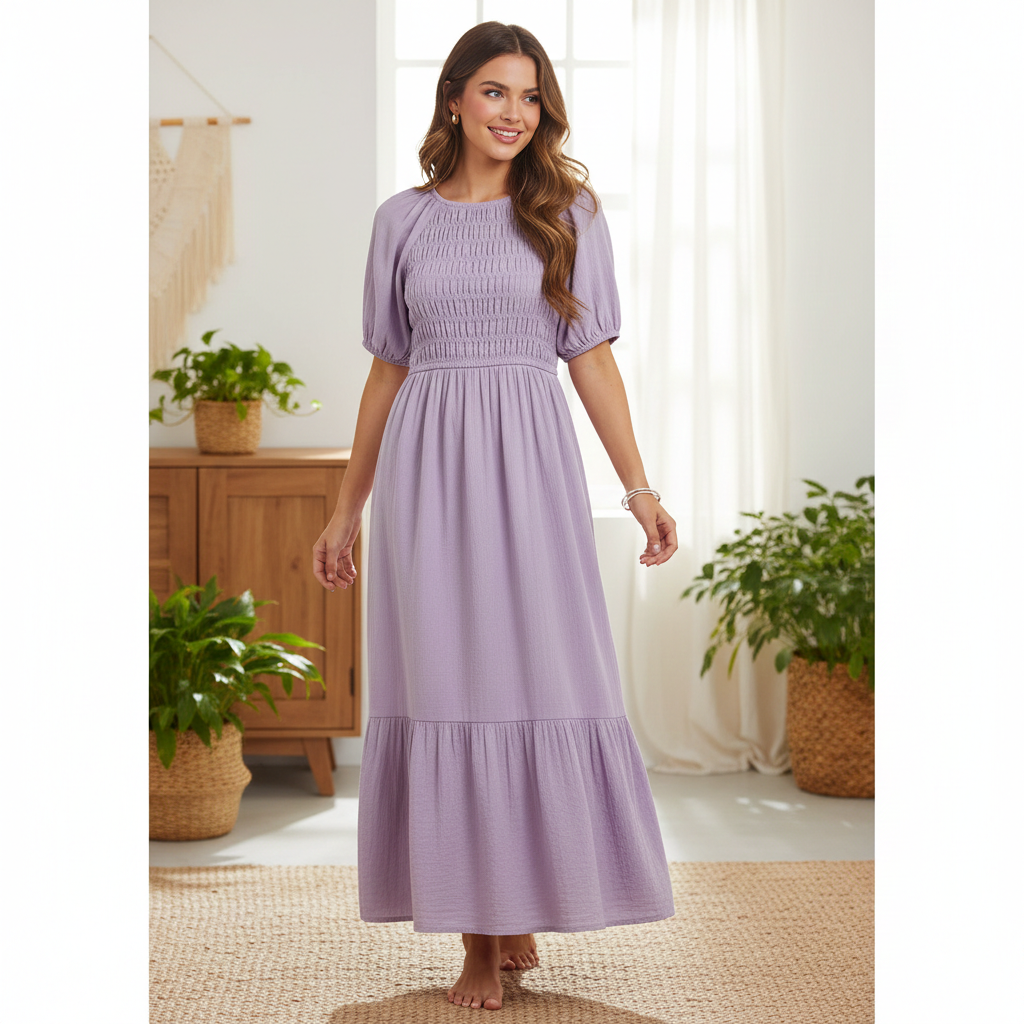 Featuring a beautifully smocked bodice, this dress provides a flattering and flexible fit while enhancing the waistline naturally. The puff sleeves and round neckline add a classic yet trendy charm, while the flowy, full-length silhouette with a tiered hem ensures elegant movement and a feminine look. The soothing lavender color adds a fresh and sophisticated appeal, making it a versatile wardrobe essential.