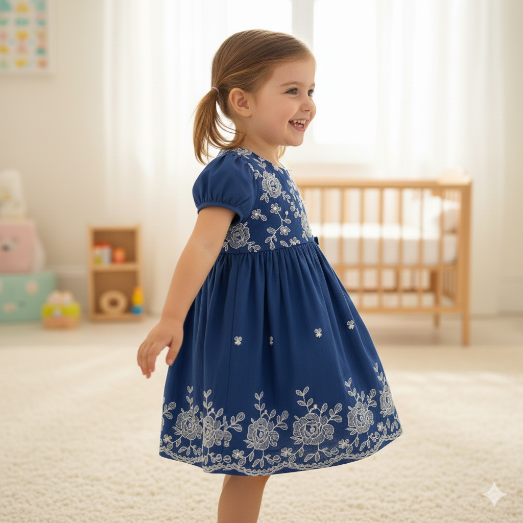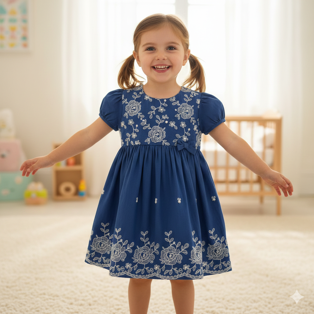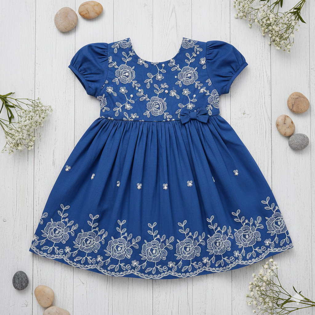 Dress your little one in timeless elegance with this royal blue floral embroidered girls frock, designed to deliver the perfect blend of comfort, style, and premium detailing. Crafted from soft, breathable fabric, this frock is gentle on the skin and ideal for all-day wear.