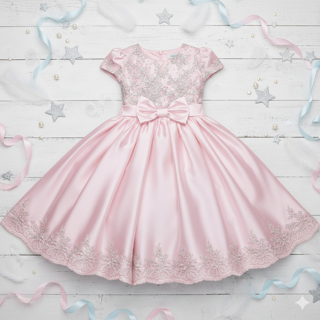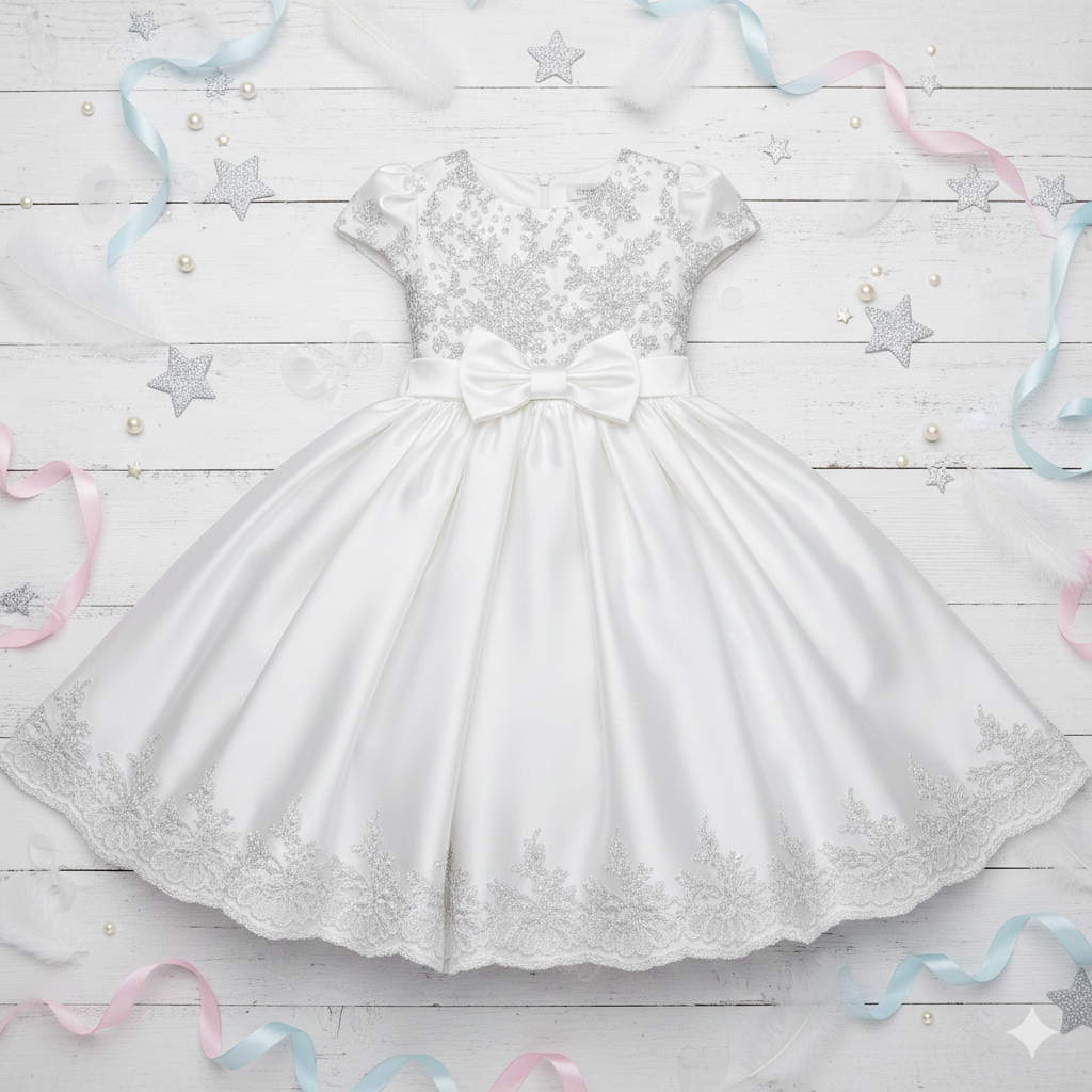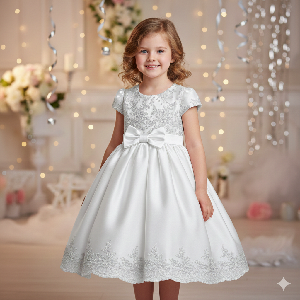Featuring intricate silver floral embroidery on the bodice and hemline, this dress offers a graceful and luxurious appeal. The short puff sleeves and round neckline add classic charm, while the beautifully flared skirt creates a princess-like silhouette. A neatly crafted bow at the waist enhances the overall look, adding sweetness and sophistication.